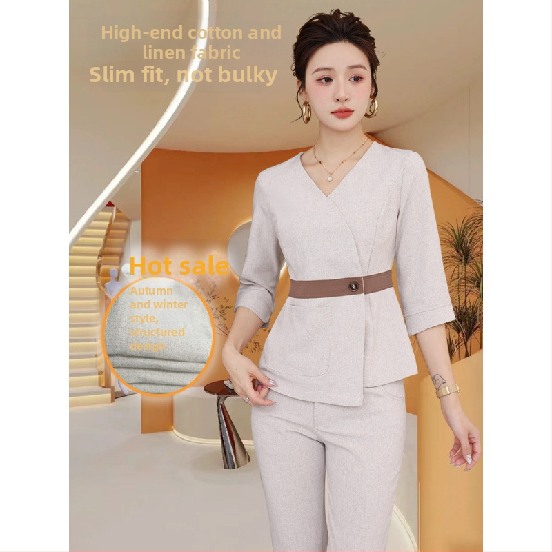 Ženský uniformný set: top + nohavice, polyester–elastan, odvádzanie vlhkosti, 3/4 rukávy, V-krk, celoročné pracovné oblečenie
