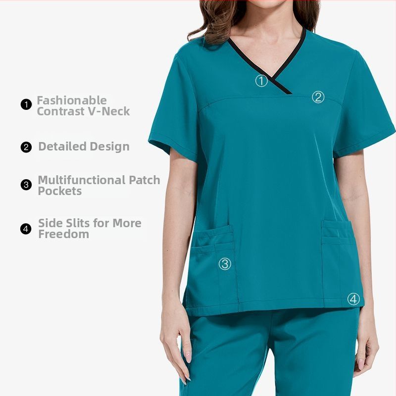 Dvojdielny izolačný set pre lekárske a zubárske pracovné oblečenie — materiál odvádzajúci vlhkosť, elastický (spandex/polyester), top s krátkymi rukávmi a nohavice po polovicu dĺžky