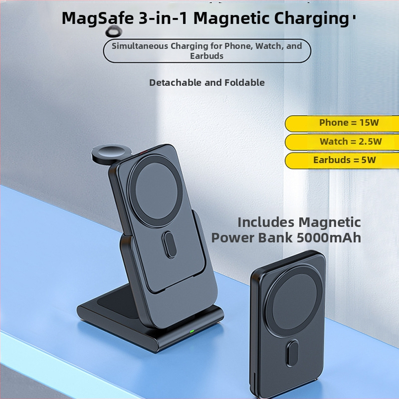MagSafe magnetická power banka so stojanom, skladací bezdrôtový nabíjač 3 v 1 pre iWatch; výstupný prúd 3A, maximálny výkon 15W, celkový výkon 22W, QC3.0